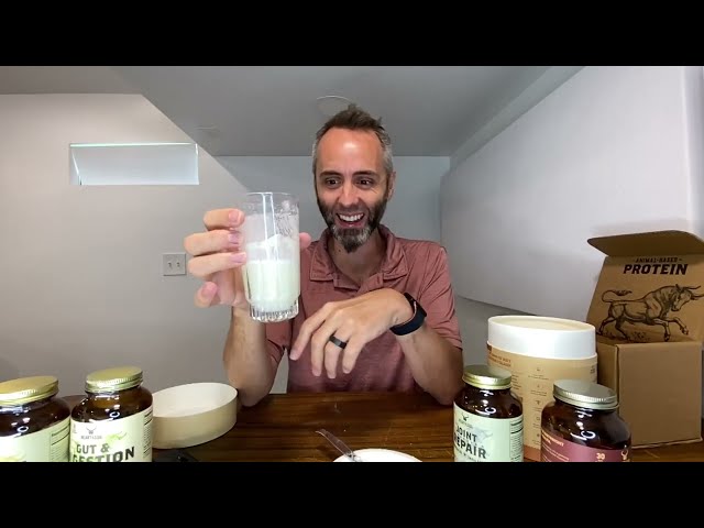 - Protein powder includes colostrum and collagen for muscle synthesis and health.